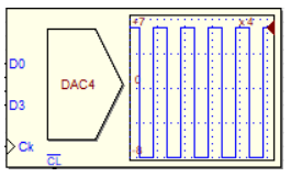 С приходом тактовых импульсов ЦАП выводи подобие прямоугольного сигнала с заходом в отрицательную область. (длительность одного периода 8 тактов).