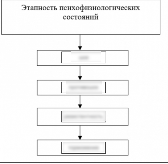 Заполните элементы блок-схемы, последовательно расположив стадии развития психофизиологических состояний: Соотнесите фазы стресса с их характеристикой: --- > настораживает и первичное, часто избыточное возбуждение в ответ на стрессор --- > реакция адаптации организма к раздражителям --- > фаза рассогласования в деятельности систем, затем проблемы в отдельных из них, способные привести к гибели организма Заполните таблицу: соотнесите характеристики психофизиологических состояний с их кратким описанием: Характеристика состояний Краткое описание каждое состояние временно и сменяется другим состоянием это качество характеризует уровень функционирования систем по типу переживаемых эмоций состояния делятся на положительные и отрицательные характеризуется степенью выраженности переживаний и сдвигов физиологических функций Соотнесите типы темперамента спортсменов с их отличительными признаками: Характеристика состояний Краткое описание низкая эмоциональная возбудимость, сохраняет спокойствие даже перед началом соревнований довольно редко занимается спортом, предпочитает посмотреть спорт по телевизору быстро думает и способен на проявление очень быстрой реакции реактивность преобладает над активностью, в трудной ситуации легко становится вспыльчивым, резким, быстро выходит из себя Вставьте пропущенное слово: Устойчивость к формированию нежелательных психофизиологических состояний, более позднее их появление, глубина неблагоприятных сдвигов зависит как от ___ факторов (в значительной мере врожденных, таких как типологические особенности свойств нервной системы, биохимические особенности), так и от ___ (эмоционального настроя) и факторов (уровня тренированности).