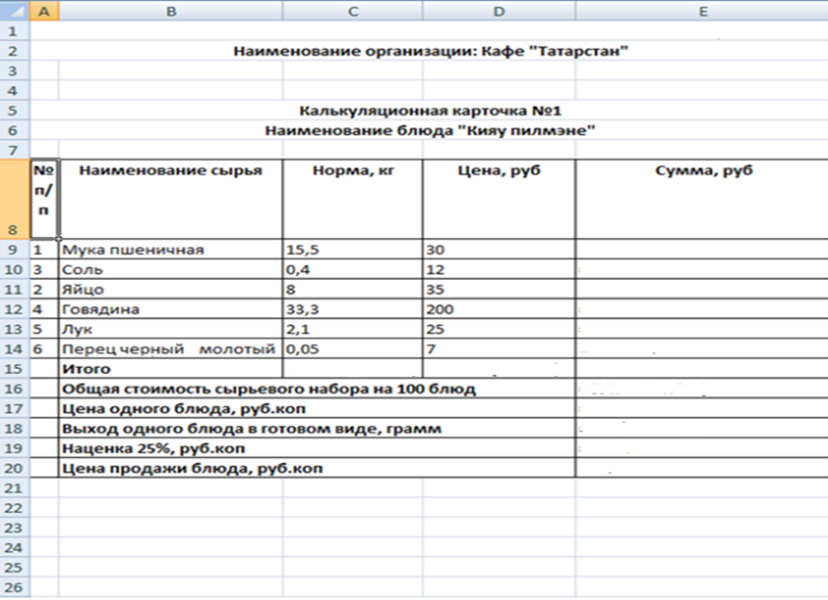 2.Заполните ячейки данными, данные внести самостоятельно.