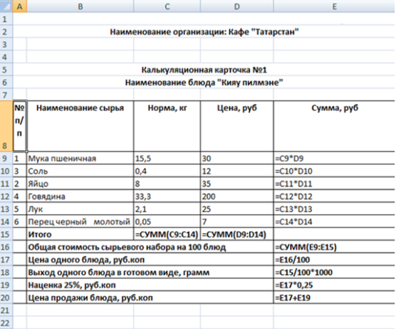 2.Рассчитайте значение Сумма, руб: 3.Рассчитайте итоговое значение по столбцу Норма, кг: 4.Рассчитайте итоговое значение по столбцу Цена, руб: 5.Рассчитайте Общую стоимость сырьевого набора на 100 блюд: 6.Рассчитайте Цену одного блюда, руб.коп: 7.Рассчитайте Выход одного блюда в готовом виде, грамм: 8.Рассчитайте Наценку 25%, руб.коп: 9.Рассчитайте Цену продажи блюда, руб.коп: Необходимые формулы приведены на Рис.1 10.Сохраните файл после проведения всех расчетов под именем ЗАДАНИЕ 2. Часть С. С3. Решите задачу. В ходе подготовки доклада руководителя возникла необходимость работы с фрагментами текста. Опишите порядок действий специалиста по документационному обеспечению управления.