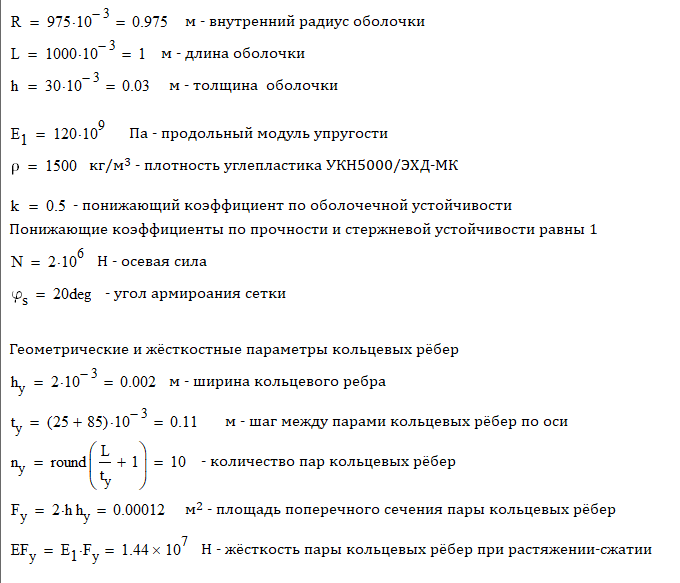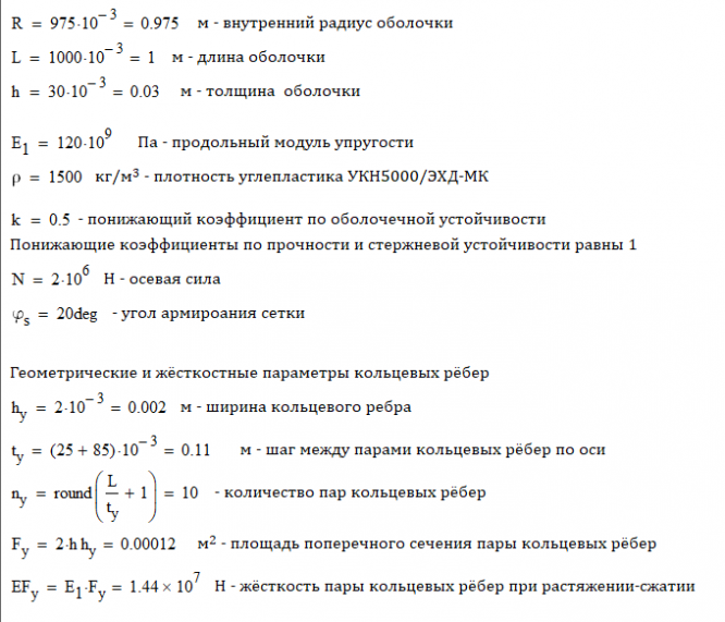 Исходные данные для расчёта - геометрические параметры оболочки и жёсткостные характеристики углепластика УКН5000/ЭХД-МК, параметры внешней нагрузки и коэффициенты устойчивости