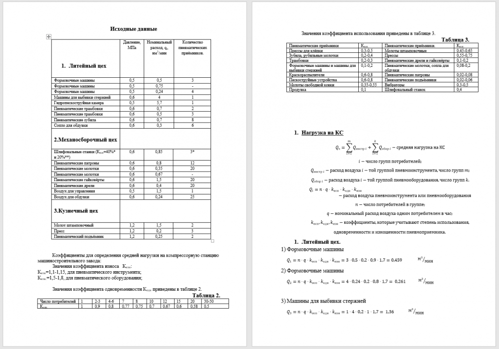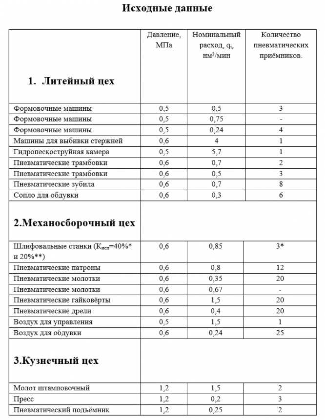Определить нагрузку и производительность компрессорной станции машиностроительного завода (варианты домашних заданий приведены в таблице 1. Подобрать компрессорные установки (указать марки и технические характеристики: производительность, давление сжатия, потребляемую мощность, тип привода, установленную мощность, расход воды, если она необходима, габариты установки и массу) для рассчитываемых компрессорных станций. Установить оборудование в МЗ. Дать эскиз с размерами.