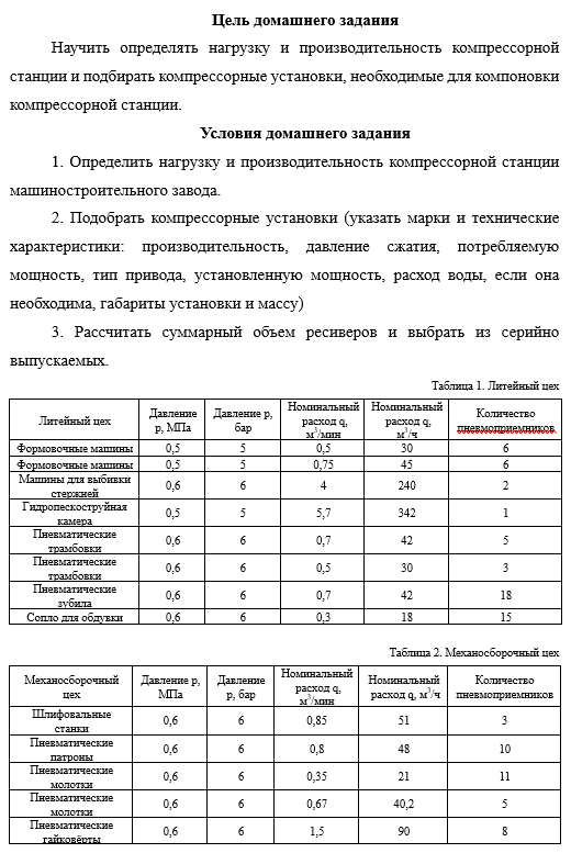 Цель домашнего задания: научить определять нагрузку и производительность компрессорной станции и подбирать компрессорные установки, необходимые для компоновки компрессорной станции..