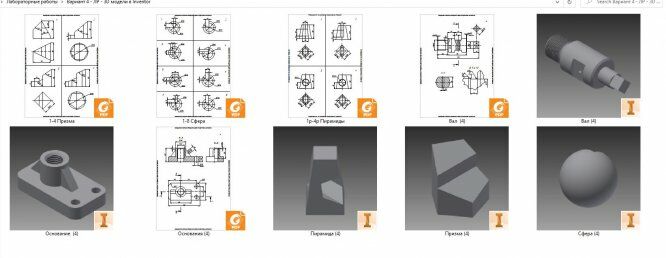 В архиве - комплект задач (5 задач - призма, пирамида, шар со сквозным отверстием, основание и вал) к лабораторным работам по инженерной и компьютерной графике за 2 семестр (Autodesk Inventor).