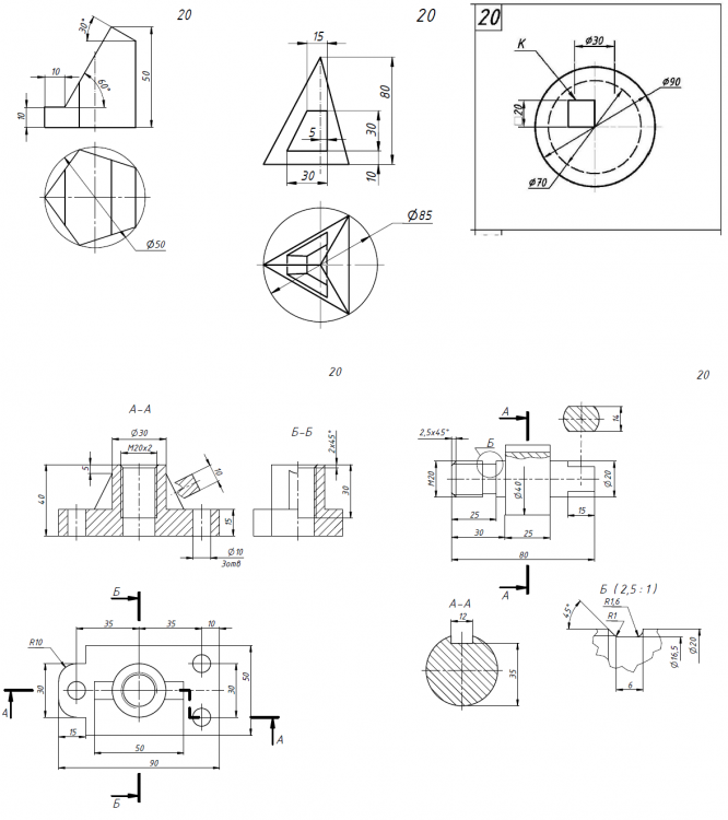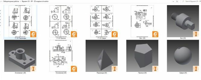 В архиве - комплект задач (5 задач - призма, пирамида, шар со сквозным отверстием, основание и вал) к лабораторным работам по инженерной и компьютерной графике за 2 семестр (Autodesk Inventor).