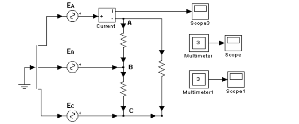 5. «Звезду» сопротивлений, согласно правилам эквивалентного преобразования «звезды» в «треугольник», преобразовать в «треугольник» сопротивлений и собрать схему, которая приведена на рисунке 5. Измерить линейные токи в каждой из фаз с помощью измерителей тока и токи межфазной нагрузки с помощью мультиметра. Вычислить соответствие между фазными и линейными напряжениями. Сравнить с расчетными данными.