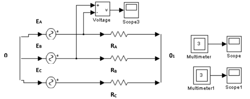 1) Создать схему трехфазной сети по схеме на рисунке 4 с источниками