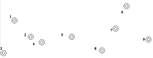 Задано, что вес каждого узла равен 1. Суммарный вес центра группы уровня h = 2 равен 3, следовательно, каждая группа должна состоять из 3-х узлов нижнего уровня. Суммарный вес центра группы уровня h = 3 равен 9. Требуется построить древовидную иерархическую сеть минимальной длины, обеспечивающую многоуровневое покрытие исходных узлов.