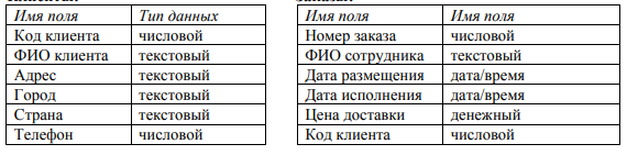Задание 2. Заполнить таблицы самостоятельно, учитывая следующую информацию: клиентов − 5-6, заказов − 12-15. Номер и ФИО одного из клиентов № зачетки и ФИО студента, 2-3 клиента не из Беларуси. Некоторые клиенты разместили только по одному заказу, а некоторые − более одного, причем хотя бы один из клиентов разместил более 3-х заказов. 3-4 заказа еще не выполнены (поле Дата исполнения пустое).
