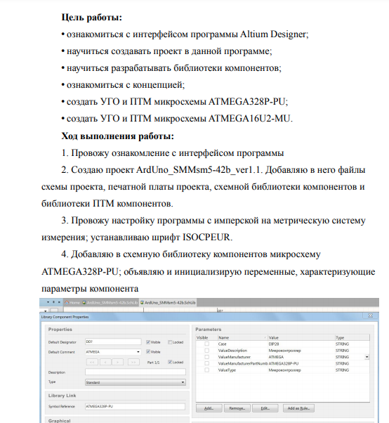 Ход выполнения работы: 1. Провожу ознакомление с интерфейсом программы 2. Создаю проект ArdUno_SMMsm5-42b_ver1.1. Добавляю в него файлы схемы проекта, печатной платы проекта, схемной библиотеки компонентов и библиотеки ПТМ компонентов. 3. Провожу настройку программы с имперской на метрическую систему измерения; устанавливаю шрифт ISOCPEUR. 4. Добавляю в схемную библиотеку компонентов микросхему ATMEGA328P-PU; объявляю и инициализирую переменные, характеризующие параметры компонента