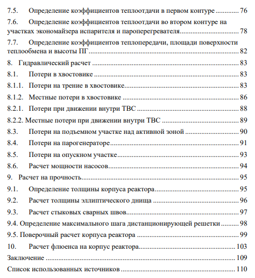2) очень подробная расчётная часть: нейтронно-физический расчёт; тепловой расчёт; расчёт запаса до наступления кризиса теплообмена; гидравлический расчёт; поверочный расчёт на прочность элементов конструкции ТВС; расчёт флюенса на корпус реактора.