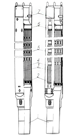 На рисунке 1 представлена рабочая кассета, которая состоит из следующих элементов: хвостовик с фиксатором 1, нижняя опорная решётка 2, центральная труба 3, пучок твэлов и твэгов 4, дистанционирующие решетки 5, чехол и система из несущих труб и уголков 6, головка 7.