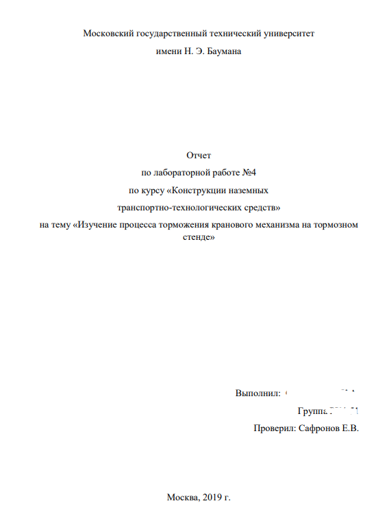 Для студентов МГТУ им. Н.Э.Баумана по предмету Конструкции наземных транспортно-технологических средств (КНТТС)Лабораторная работа №4 (Изучение процесса торможения кранового механизма на тормозном стенде)Лабораторная работа №4 (Изучение процесса торможения кранового механизма на тормозном стенде)