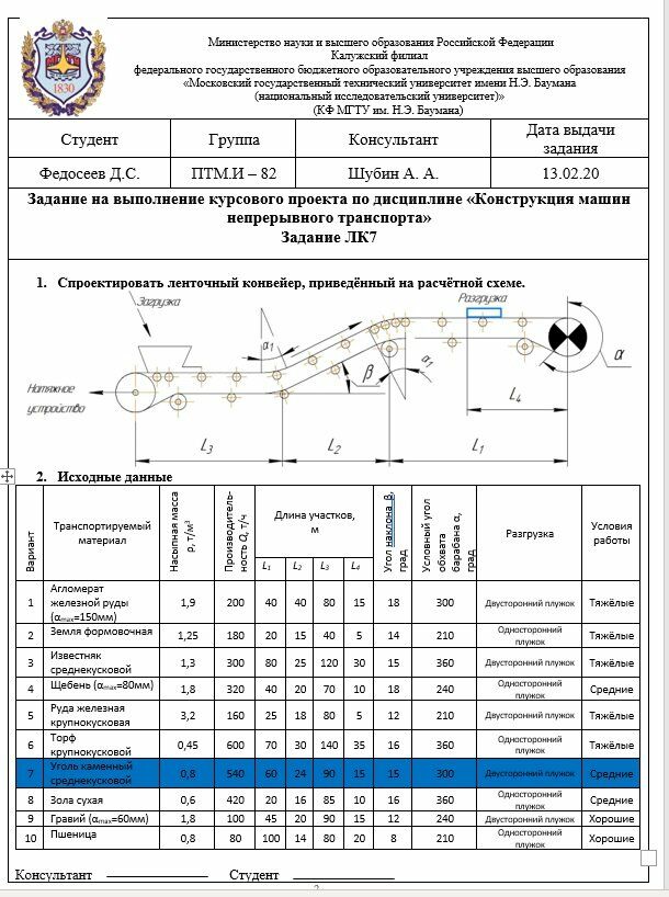 Курсовая работа МНТ 147: Проектирование машины непрерывного транспорта. Спроектировать ленточный конвейер. вариант 7