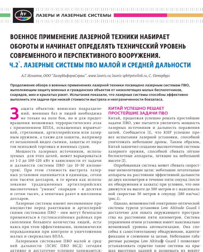 Продолжение обзора о военных применениях лазерной техники посвящено лазерным системам ПВО, выполняющим защиту военных и гражданских объектов от низколетящих малых беспилотников, снарядов, мин и крылатых ракет. Испытания показали, что лазерные системы способны эффективно выполнить эти задачи при низкой стоимости выстрела и неограниченности боезапаса. Защита объектов: воинских подразделе ний, военных баз и людей необходима не только на поле боя, но и для предот вращения возможных террористических атак с применением БПЛА, оснащенных взрывчат кой, стрелковым, артиллерийским или лазер ным оружием, а также для защиты, например от незаконной видео съемки, защиты от пира тов экипажей торговых и военных судов. Мощность лазерных источников, исполь зуемых для этих целей, может варьироваться от 1–2 до 100–120 кВт в зависимости от задачи и дальности системы ПВО (до 10–30 киломе тров). При этом стоимость выстрела лазер ных установок оценивается в единицы, сотни или тысячи долларов, в то время как исполь зование традиционных артиллерийских высокоточных "умных" снарядов – в десятки и сотни тысяч, а зенитных ракет в миллионы долларов. Лазерные системы имеют несомненное пре имущество перед ракетными и артиллерий скими системами ПВО – они могут безопасно применяться в густонаселённых районах при скоплении большого количества людей, оста ваясь при этом эффективными, экономически оправданными при контроле и уничтожении малых и сверхмалых БПЛА. Лазерными системами ПВО малой и сред ней дальности (ЛСИС ПВО МСД) сегодня активно и достаточно успешно занимаются: Китай [1–3], Турция [4], Франция [5], Япония [6], Израиль [7, 8], Германия [9–13], США [14–21] и другие страны. * Ч.1 см.: ФОТОНИКА, 2016, № 4, с. 126–138. КИтай усПешнО решает ПрОстейшИе ЗадачИ ПВО Китай, продолжая успешно решать простейшие задачи ПВО, уже пытается увеличить мощность лазерных источников и дальность поражения целей. Сообщается [1], что КНР успешно про вел испытания лазерной установки, способной уничтожать небольшие дроны. Таким образом, Китай закончил создание высокоточной системы лазерного оружия, способной сбивать лёгкие беспилотные аппараты, летящие на небольшой высоте [2]. Опробованная система может сбивать скорост ные низколетящие цели: небольшие летательные аппараты на расстоянии эффективной дальности до двух километров в течение пяти секунд (после их обнаружения и захвата) при условии, что они движутся на высоте до 500 метров и с максималь ной скоростью 50 метров в секунду (180 км/час) (рис.1). Однако, возможностей электронно-оптической системы турели установки Low Altitude Guard I достаточно для охвата окружающего простран ства на расстоянии пяти километров. Система управления огнем установки имеет максимально возможный уровень автоматизации. Она спо собна к самостоятельному обнаружению, иденти фикации и слежению за целью. Небольшие габа ритные размеры Low Altitude Guard I позволяют устанавливать скрытно такие системы на кры шах высотных зданий и размещать их вокруг инфраструктуры защищаемых объектов, вокруг атомных электростанций, промышленных пред приятий, аэродромов и военных баз. Кроме этого, лазеры являются более дешевым и более безопас ным, по сравнению с ракетами и зенитными ор