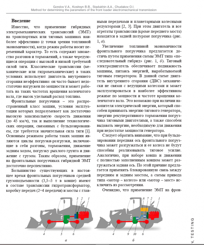 ÓДÊ 629.365 DOI: 10.31992/0321-4443-2021-5-38-45 МЕТОД ОПРЕДЕЛЕНИЯ ПАРАМЕТРОВ ЭЛЕКТРОМЕХАНИЧЕСКОЙ ТРАНСМИССИИ ФРОНТАЛЬНОГО ПОГРУЗЧИКА METHOD FOR DETERMINING THE PARAMETERS OF THE FRONT LOADER ELECTROMECHANICAL TRANSMISSION В.А. ГОРЕЛОВ1, д.т.н. Б.Б. КОСИЦЫН2, к.т.н. А.А. СТАДУХИН2, к.т.н. О.И. ЧУДАКОВ2, к.т.н. 1ФГБОУ ВО «ЧГУ им. И.Н. Ульянова», Чебоксары, Россия, gvas@mail.ru 2МГТУ им. Н.Э. Баумана, Москва, Россия, ant.m9@yandex.ru V.A. GORELOV1, Dsc in Engineering B.B. KOSITSYN2, PhD in Engineering A.A. STADUKHIN2, PhD in Engineering O.I. CHUDAKOV2, PhD in Engineering 1 Chuvash State University named after Ilya N. Ulyanov, Cheboksary, Russia, gvas@mail.ru 2 Bauman Moscow State Technical University, Moscow, Russia, ant.m9@yandex.ru Предлагается метод расчета тягового электродвигателя гибридной трансмиссии фронтального погрузчика. Ука зано, что для данных машин характерен режим работы, имеющий множество разгонов и торможений, а также чередующиеся операции с высокой и низкой требуемой силой тяги. Предложена схема электромеханической трансмиссии, которая может эффективно применяться в таких условиях. В предложенном методе используется понятие величины диапазона электродвигателя, которую можно использо вать для выбора конкретного электродвигателя, обеспечивающего требуемую подвижность машины. Для фрон тального погрузчика грузоподъемностью 3500 кг максимальной скоростью 40 км/ч и максимальной удельной тягой 1 были определены основные параметры тягового электродвигателя. Однако для трансмиссии с одним фик сированным передаточным отношением (ЭМТ1) был получен электродвигатель с чрезмерно большой мощно стью. Поэтому было проведено определение характеристик электродвигателя для электромеханической транс миссии с двумя фиксированными передаточными отношениями (ЭМТ2). В процессе расчета этой трансмиссии была получена значительно меньшая необходимая мощность двигателя. В статье проведена приблизительная оценка энергоэффективности трансмиссий ЭМТ1 и ЭМТ2. Для этого ис пользовался метод определения КПД электродвигателя в зависимости от режима его работы (от текущей угло вой скорости вала и крутящего момента). Определено, что трансмиссия ЭМТ2 обладает лучшим КПД электро двигателя как при бульдозерной операции, так и при движении на максимальной скорости. Общий вывод заключается в том, что для рассматриваемого применения наиболее рационально применять транс миссию с двумя фиксированными передаточными отношениями. В качестве дальнейшего направления исследо вания выделено применение имитационного компьютерного моделирования для оценки энергоэффективности ТЕОРИЯ, КОНСТРУИРОВАНИЕ, ИСПЫТАНИЯ 38 погрузчика в цикле погрузки-разгрузки. Ключевые слова: фронтальный погрузчик, тяговый расчет, тяговый электропривод, ступенчатая трансмиссия. Для цитирования: Горелов В.А., Косицын Б.Б., Стадухин А.А., Чудаков О.И. Метод определения параметров электромеханической трансмиссии фронтального погрузчика // Тракторы и сельхозмашины. 2021. № 5. С. 38–45. DOI: 10.31992/0321-4443-2021-5-38-45 A method for calculating the traction motor of a hybrid transmission of a front-end loader is proposed. It is indicated that these vehicles are characterized by a mode of operation with multiple accelerations and decelerations, as well as al ternating operations with high and low required traction force. An electromechanical transmission scheme is proposed. This scheme can be effectively used in such conditions. The proposed method uses the concept of the magnitude of the range of an electric motor, which can be used to select a specific electric motor that provides the required mobility of the vehicle. For a front loader with a lifting capacity of 3500 kg, a maximum speed of 40 km / h and a maximum specific thrust of 1, the main parameters of the traction motor were determined. However, for the transmission with one fixed gear ratio (EMT1), an electric motor with an excessively high power was 