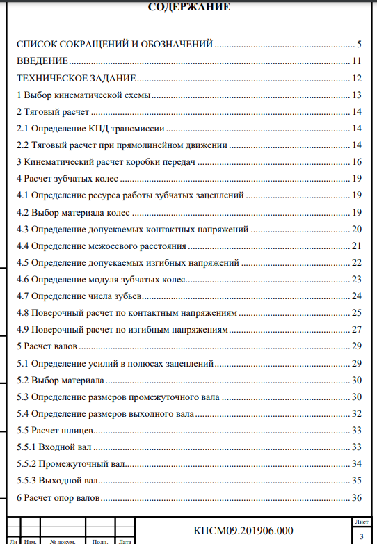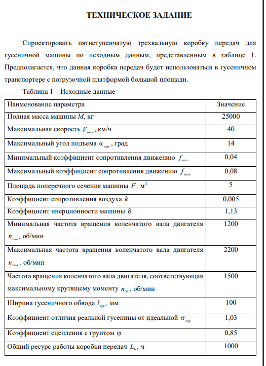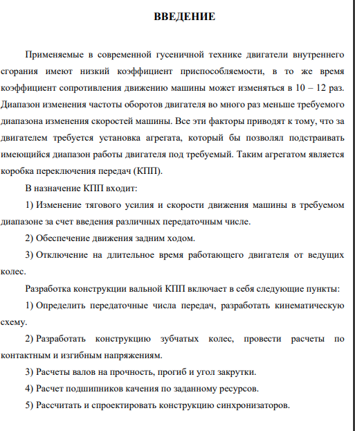 Применяемые в современной гусеничной технике двигатели внутреннего сгорания имеют низкий коэффициент приспособляемости, в то же время коэффициент сопротивления движению машины может изменяться в 10 – 12 раз. Диапазон изменения частоты оборотов двигателя во много раз меньше требуемого диапазона изменения скоростей машины. Все эти факторы приводят к тому, что за двигателем требуется установка агрегата, который бы позволял подстраивать имеющийся диапазон работы двигателя под требуемый. Таким агрегатом является коробка переключения передач (КПП). В назначение КПП входит: 1) Изменение тягового усилия и скорости движения машины в требуемом диапазоне за счет введения различных передаточным числе. 2) Обеспечение движения задним ходом. 3) Отключение на длительное время работающего двигателя от ведущих колес. Разработка конструкции вальной КПП включает в себя следующие пункты: 1) Определить передаточные числа передач, разработать кинематическую схему. 2) Разработать конструкцию зубчатых колес, провести расчеты по контактным и изгибным напряжениям. 3) Расчеты валов на прочность, прогиб и угол закрутки. 4) Расчет подшипников качения по заданному ресурсов. 5) Рассчитать и спроектировать конструкцию синхронизаторов.