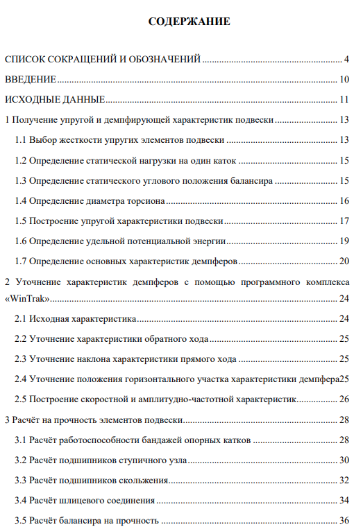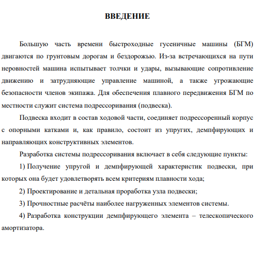 Большую часть времени быстроходные гусеничные машины (БГМ) двигаются по грунтовым дорогам и бездорожью. Из-за встречающихся на пути неровностей машина испытывает толчки и удары, вызывающие сопротивление движению и затрудняющие управление машиной, а также угрожающие безопасности членов экипажа. Для обеспечения плавного передвижения БГМ по местности служит система подрессоривания (подвеска). Подвеска входит в состав ходовой части, соединяет подрессоренный корпус с опорными катками и, как правило, состоит из упругих, демпфирующих и направляющих конструктивных элементов. Разработка системы подрессоривания включает в себя следующие пункты: 1) Получение упругой и демпфирующей характеристик подвески, при которых она будет удовлетворять всем критериям плавности хода; 2) Проектирование и детальная проработка узла подвески; 3) Прочностные расчёты наиболее нагруженных элементов системы. 4) Разработка конструкции демпфирующего элемента – телескопического амортизатора.