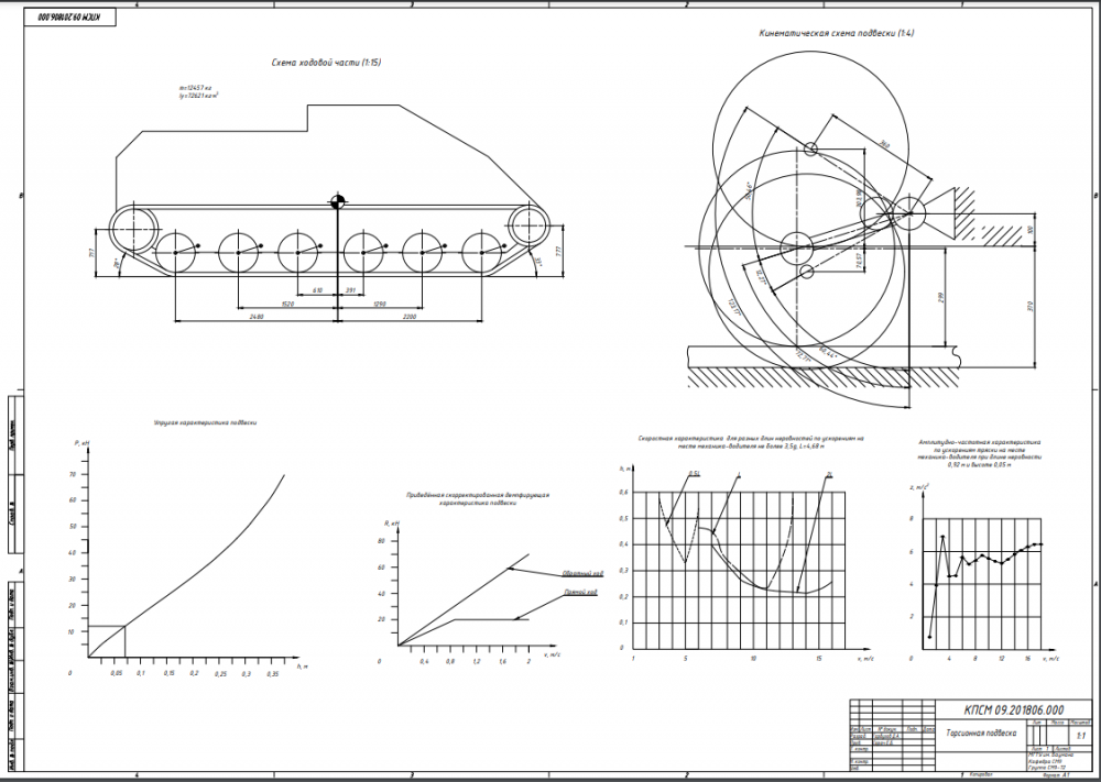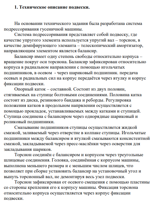 На основании технического задания была разработана система подрессоривания гусеничной машины. Система подрессоривания представляет собой подвеску, где качестве упругого элемента используется упругий вал – торсион, в качестве демпфирующего элеманта – телескопический амортизатор, направляющим элементом является балансир. Балансир имеет одну степень свободы относительно корпуса – вращение покруг оси торсиона. Балансир зафиксирован относительно корпуса в радиальном направлении с помощью игольчатых подшипников, в осевом - через шариковый подшипник. передача осевых и радиальных сил на корпус передаётся через втулку и корпус фиксации подвески. Опорный каток – составной. Состоит из двух половин, стягиваемых на ступице болтовыми соединениями. Половина катка состоит из диска, резинового бандажа и реборды. Регулировка положения катков в продольном напрвлении осуществляется с помощью прокладок, устанавливаемых между катками и ступицей. Ступица соединена с балансиром через однорядные шариковый и роликовый подшипники. Смазывание подшипников ступицы осуществляется жидкой смазкой, заливаемый через отверстие в колпаке ступицы. Игольчатые подшипники между балансиром и втулкой смазываются консистентной смазкой, закладываемой через пресс-маслёнки через осверстия для закладывания шариков.