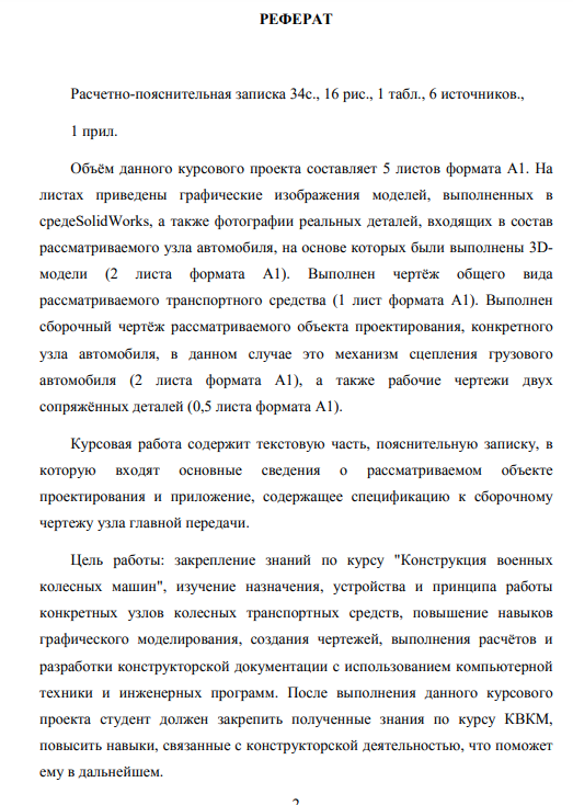 Объём данного курсового проекта составляет 5 листов формата А1. На листах приведены графические изображения моделей, выполненных в средеSolidWorks, а также фотографии реальных деталей, входящих в состав рассматриваемого узла автомобиля, на основе которых были выполнены 3Dмодели (2 листа формата А1). Выполнен чертёж общего вида рассматриваемого транспортного средства (1 лист формата А1). Выполнен сборочный чертёж рассматриваемого объекта проектирования, конкретного узла автомобиля, в данном случае это механизм сцепления грузового автомобиля (2 листа формата А1), а также рабочие чертежи двух сопряжённых деталей (0,5 листа формата А1).