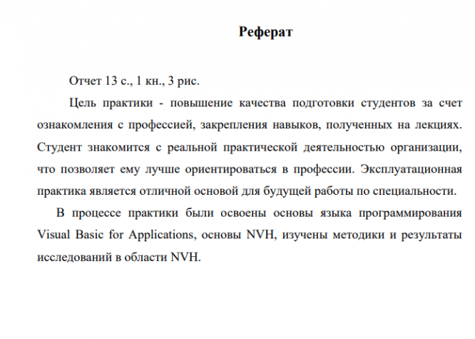 Цель практики - повышение качества подготовки студентов за счет ознакомления с профессией, закрепления навыков, полученных на лекциях. Студент знакомится с реальной практической деятельностью организации, что позволяет ему лучше ориентироваться в профессии. Эксплуатационная практика является отличной основой для будущей работы по специальности. В процессе практики были освоены основы языка программирования Visual Basic for Applications, основы NVH, изучены методики и результаты исследований в области NVH.