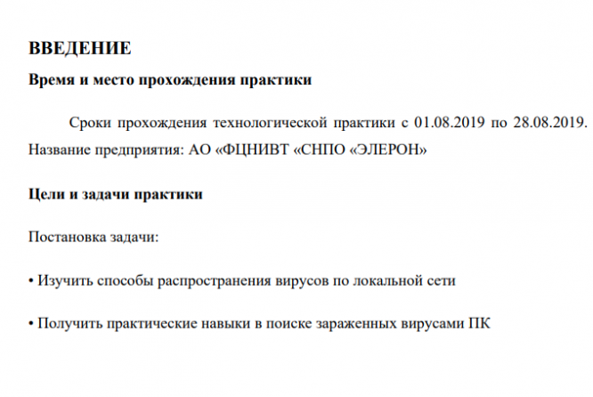 Время и место прохождения практики Сроки прохождения технологической практики с 01.08.2019 по 28.08.2019. Название предприятия: АО «ФЦНИВТ «СНПО «ЭЛЕРОН» Цели и задачи практики Постановка задачи: • Изучить способы распространения вирусов по локальной сети • Получить практические навыки в поиске зараженных вирусами ПК