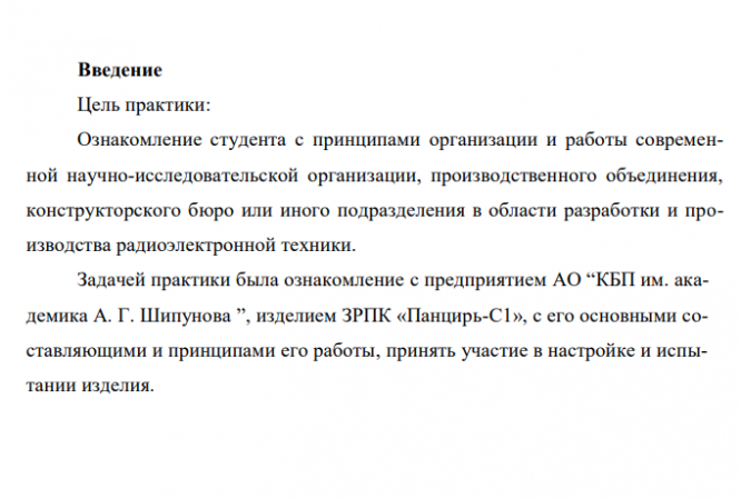 Цель практики: Ознакомление студента с принципами организации и работы современной научно-исследовательской организации, производственного объединения, конструкторского бюро или иного подразделения в области разработки и производства радиоэлектронной техники. Задачей практики была ознакомление с предприятием АО “КБП им. академика А. Г. Шипунова ”, изделием ЗРПК «Панцирь-С1», с его основными составляющими и принципами его работы, принять участие в настройке и испытании изделия.