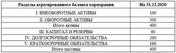 Проанализируйте данные агрегированного бухгалтерского баланса корпорации АО «Мир», представленного в таблице. Доля собственного капитала организации составляет… %