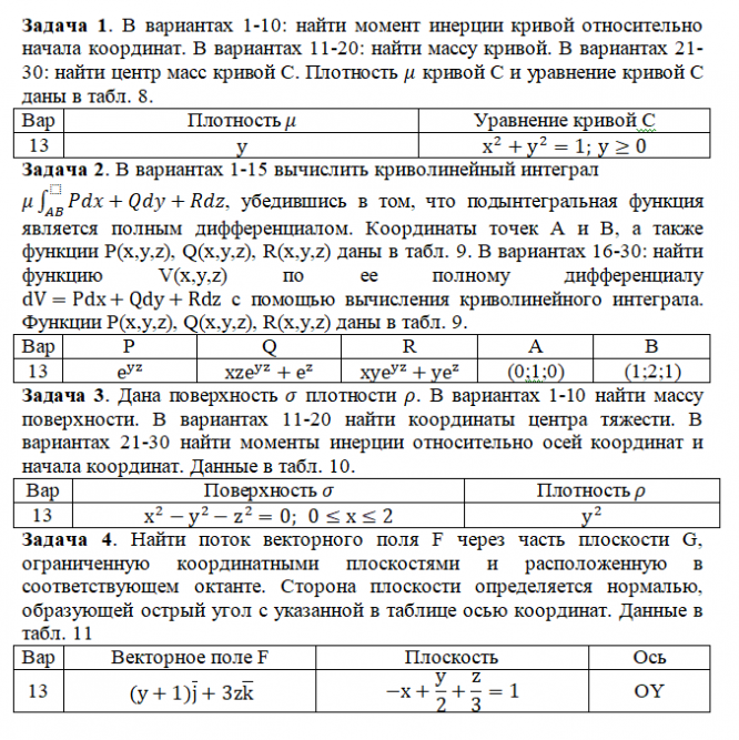Задача 1. В вариантах 1-10: найти момент инерции кривой относительно начала координат. В вариантах 11-20: найти массу кривой. В вариантах 21-30: найти центр масс кривой С. Плотность кривой С и уравнение кривой С даны в табл. 8. Задача 2. В вариантах 1-15 вычислить криволинейный интеграл , убедившись в том, что подынтегральная функция является полным дифференциалом. Координаты точек Aи B, а также функции P(x,y,z), Q(x,y,z), R(x,y,z) даны в табл. 9. В вариантах 16-30: найти функцию V(x,y,z) по ее полному дифференциалу с помощью вычисления криволинейного интеграла. Функции P(x,y,z), Q(x,y,z), R(x,y,z) даны в табл. 9. Задача 3.