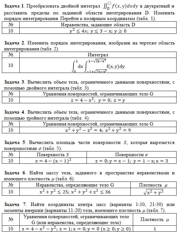 Задача 1 . Преобразовать двойной интеграл в двукратный и расставить пределы по заданной области интегрирования D . Изменить порядок интегрирования. Перейти к полярным координатам (табл. 1). Задача 2 . Изменить порядок интегрирования, изобразив на чертеже область интегрирования (табл. 2). Задача 3 . Вычислить объем тела, ограниченного данными поверхностями, с помощью двойного интеграла (табл. 3). Задача 4 . Вычислить объем тела, ограниченного данными поверхностями, с помощью тройного интеграла (табл. 4). Задача 5 . Вычислить площадь части поверхности , которая вырезается поверхностями (табл. 5). Задача 6 . Найти массу тела, заданного в пространстве неравенствами и имеющего плотность (табл.