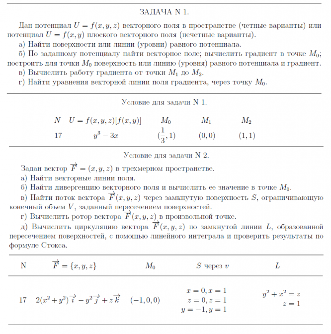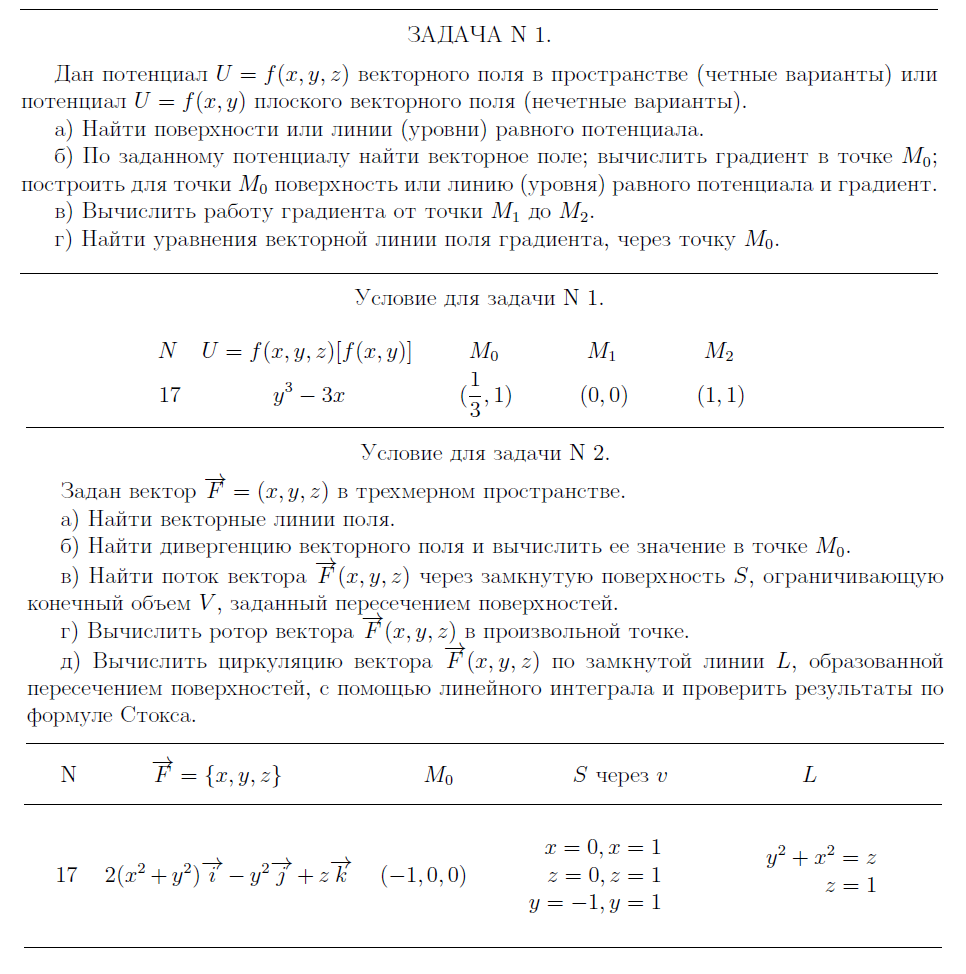 УСЛОВИЕ К ДЗ ”Теория поля” ЗАДАЧА N 1. Дан потенциал U = f(x, y, z) векторного поля в пространстве (четные варианты) или потенциал U = f(x, y) плоского векторного поля (нечетные варианты). а) Найти поверхности или линии (уровни) равного потенциала. б) По заданному потенциалу найти векторное поле; вычислить градиент в точке M0; построить для точки M0 поверхность или линию (уровня) равного потенциала и градиент. в) Вычислить работу градиента от точки M1 до M2. г) Найти уравнения векторной линии поля градиента, через точку M0. Условие для задачи N 1 Условие для задачи N 2. Задан вектор −→F = (x, y, z) в трехмерном пространстве. а) Найти векторные линии поля.