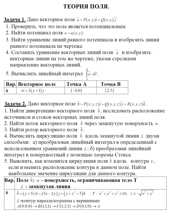 ТЕОРИЯ ПОЛЯ. Задача 1. Дано векторное поле 1. Проверить, что это поле является потенциальным. 2. Найти потенциал поля 3. Найти уравнение линий равного потенциала и изобразить линии равного потенциала на чертеже. 4. Составить уравнение векторных линий поля и изобразить векторные линии на том же чертеже, указав стрелками направление векторных линий. 5. Вычислить линейный интеграл . Задача 2. Дано векторное поле . 1. Найти дивергенцию векторного поля , исследовать расположение источников и стоков векторных линий поля. 2. Найти поток векторного поля через замкнутую поверхность . 3. Найти ротор векторного поля . 4. Вычислить циркуляцию поля вдоль замкнутой линии двумя способами: а) преобразовав линейный интеграл в определенный с использованием уравнений линии ; б) преобразовав линейный интеграл в поверхностный с помощью теоремы Стокса.