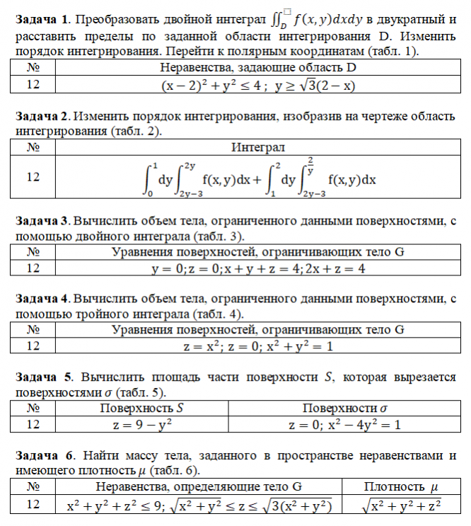 Задача 1 . Преобразовать двойной интеграл  в двукратный и расставить пределы по заданной области интегрирования  D . Изменить порядок интегрирования. Перейти к полярным координатам (табл. 1).  Задача 2 . Изменить порядок интегрирования, изобразив на чертеже область интегрирования (табл. 2).  Задача 3 . Вычислить объем тела, ограниченного данными поверхностями, с помощью двойного интеграла (табл. 3).  Задача 4 . Вычислить объем тела, ограниченного данными поверхностями, с помощью тройного интеграла (табл. 4).  Задача 5 . Вычислить площадь части поверхности  , которая вырезается поверхностями   (табл. 5).  Задача 6 . Найти массу тела, заданного в пространстве неравенствами и имеющего плотность    (табл.