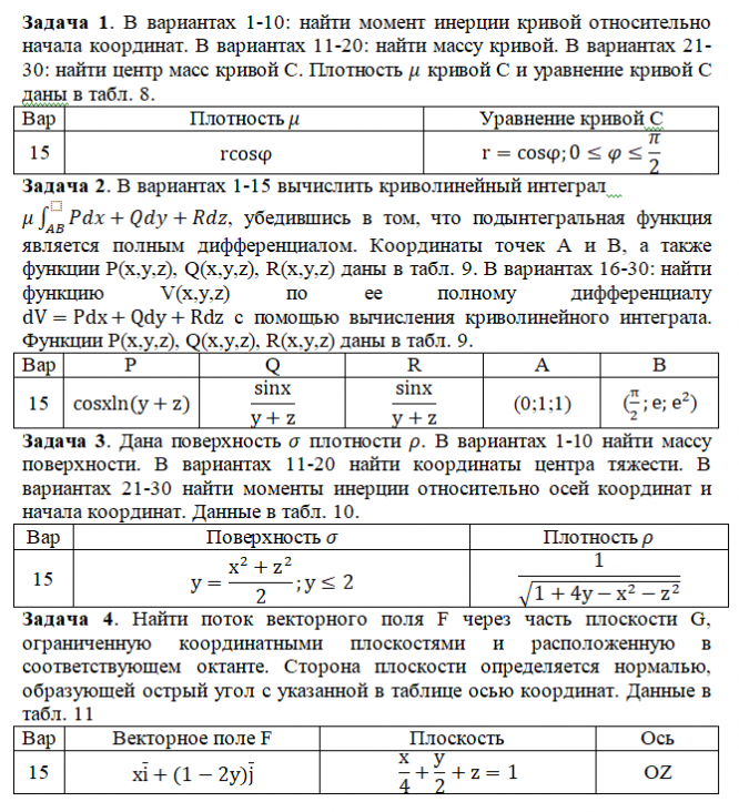 Задача 1. В вариантах 1-10: найти момент инерции кривой относительно начала координат. В вариантах 11-20: найти массу кривой. В вариантах 21-30: найти центр масс кривой С. Плотность  кривой С и уравнение кривой С даны в табл. 8. Задача 2. В вариантах 1-15 вычислить криволинейный интеграл , убедившись в том, что подынтегральная функция является полным дифференциалом. Координаты точек Aи B, а также функции P(x,y,z), Q(x,y,z), R(x,y,z) даны в табл. 9. В вариантах 16-30: найти функцию V(x,y,z) по ее полному дифференциалу  с помощью вычисления криволинейного интеграла. Функции P(x,y,z), Q(x,y,z), R(x,y,z) даны в табл. 9. Задача 3. Дана поверхность  плотности .