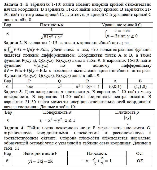 Задача 1. В вариантах 1-10: найти момент инерции кривой относительно начала координат. В вариантах 11-20: найти массу кривой. В вариантах 21-30: найти центр масс кривой С. Плотность кривой С и уравнение кривой С даны в табл. 8. Задача 2. В вариантах 1-15 вычислить криволинейный интеграл , убедившись в том, что подынтегральная функция является полным дифференциалом. Координаты точек Aи B, а также функции P(x,y,z), Q(x,y,z), R(x,y,z) даны в табл. 9. В вариантах 16-30: найти функцию V(x,y,z) по ее полному дифференциалу с помощью вычисления криволинейного интеграла. Функции P(x,y,z), Q(x,y,z), R(x,y,z) даны в табл. 9. Задача 3.