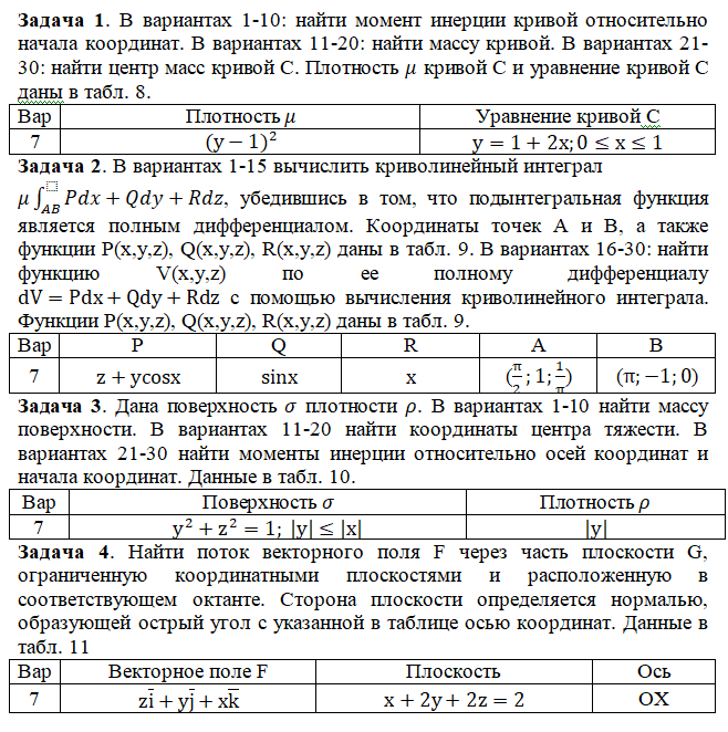 Задача 1. В вариантах 1-10: найти момент инерции кривой относительно начала координат. В вариантах 11-20: найти массу кривой. В вариантах 21-30: найти центр масс кривой С. Плотность кривой С и уравнение кривой С даны в табл. 8. Задача 2. В вариантах 1-15 вычислить криволинейный интеграл , убедившись в том, что подынтегральная функция является полным дифференциалом. Координаты точек Aи B, а также функции P(x,y,z), Q(x,y,z), R(x,y,z) даны в табл. 9. В вариантах 16-30: найти функцию V(x,y,z) по ее полному дифференциалу с помощью вычисления криволинейного интеграла. Функции P(x,y,z), Q(x,y,z), R(x,y,z) даны в табл. 9. Задача 3.