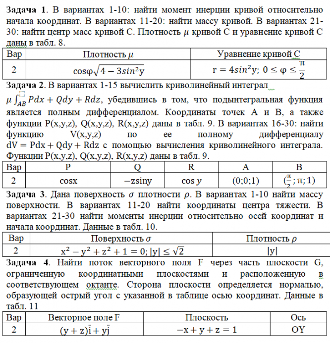 Задача 1. В вариантах 1-10: найти момент инерции кривой относительно начала координат. В вариантах 11-20: найти массу кривой. В вариантах 21-30: найти центр масс кривой С. Плотность кривой С и уравнение кривой С даны в табл. 8. Задача 2. В вариантах 1-15 вычислить криволинейный интеграл , убедившись в том, что подынтегральная функция является полным дифференциалом. Координаты точек Aи B, а также функции P(x,y,z), Q(x,y,z), R(x,y,z) даны в табл. 9. В вариантах 16-30: найти функцию V(x,y,z) по ее полному дифференциалу с помощью вычисления криволинейного интеграла. Функции P(x,y,z), Q(x,y,z), R(x,y,z) даны в табл. 9. Задача 3.