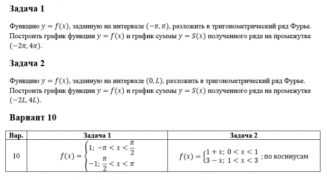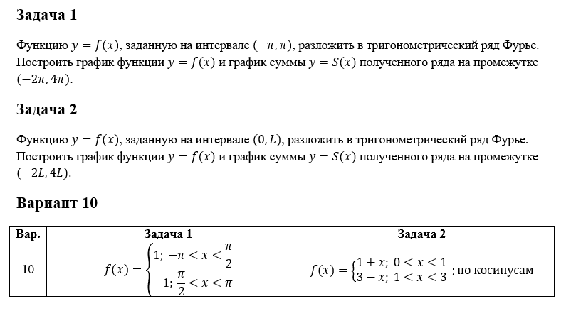 Задача 1 Функцию y=f(x), заданную на интервале (-π,π), разложить в тригонометрический ряд Фурье. Построить график функции y=f(x) и график суммы y=S(x) полученного ряда на промежутке (-2π,4π). Задача 2 Функцию y=f(x), заданную на интервале (0,L), разложить в тригонометрический ряд Фурье. Построить график функции y=f(x) и график суммы y=S(x) полученного ряда на промежутке (-2L,4L). Вариант 10 Вар.Задача 1Задача 2 10f(x)={█(1; -π<x<π/2@-1; π/2<x<π)┤f(x)={█(1+x; 0<x<1@3-x; 1<x<3)┤ ;по косинусам .
