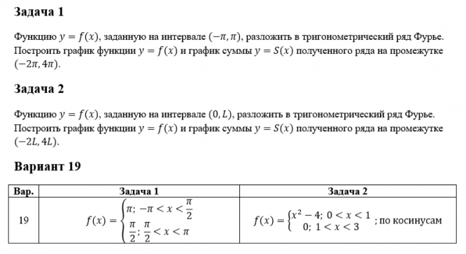 Задача 1 Функцию y=f(x), заданную на интервале (-π,π), разложить в тригонометрический ряд Фурье. Построить график функции y=f(x) и график суммы y=S(x) полученного ряда на промежутке (-2π,4π). Задача 2 Функцию y=f(x), заданную на интервале (0,L), разложить в тригонометрический ряд Фурье. Построить график функции y=f(x) и график суммы y=S(x) полученного ряда на промежутке (-2L,4L). Вариант 19 Вар.Задача 1Задача 2 19f(x)={█(π; -π<x<π/2@π/2; π/2<x<π)┤f(x)={█(x^2-4; 0<x<1@0; 1<x<3)┤ ;по косинусам .