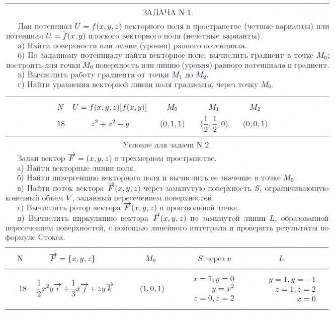 УСЛОВИЕ К ДЗ ”Теория поля” ЗАДАЧА N 1. Дан потенциал U = f(x, y, z) векторного поля в пространстве (четные варианты) или потенциал U = f(x, y) плоского векторного поля (нечетные варианты). а) Найти поверхности или линии (уровни) равного потенциала. б) По заданному потенциалу найти векторное поле; вычислить градиент в точке M0; построить для точки M0 поверхность или линию (уровня) равного потенциала и градиент. в) Вычислить работу градиента от точки M1 до M2. г) Найти уравнения векторной линии поля градиента, через точку M0. Условие для задачи N 1 Условие для задачи N 2. Задан вектор −→F = (x, y, z) в трехмерном пространстве. а) Найти векторные линии поля.