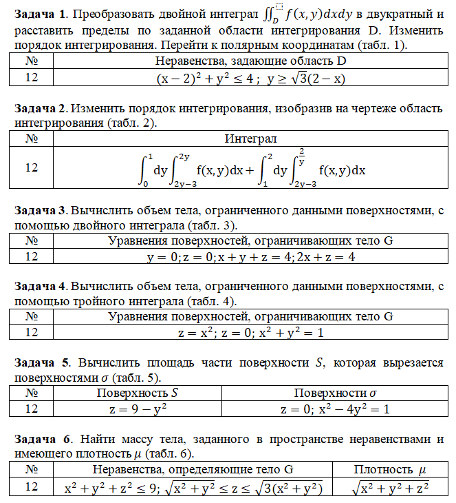 Задача 1 . Преобразовать двойной интеграл в двукратный и расставить пределы по заданной области интегрирования D . Изменить порядок интегрирования. Перейти к полярным координатам (табл. 1). Задача 2 . Изменить порядок интегрирования, изобразив на чертеже область интегрирования (табл. 2). Задача 3 . Вычислить объем тела, ограниченного данными поверхностями, с помощью двойного интеграла (табл. 3). Задача 4 . Вычислить объем тела, ограниченного данными поверхностями, с помощью тройного интеграла (табл. 4). Задача 5 . Вычислить площадь части поверхности , которая вырезается поверхностями (табл. 5). Задача 6 . Найти массу тела, заданного в пространстве неравенствами и имеющего плотность (табл.