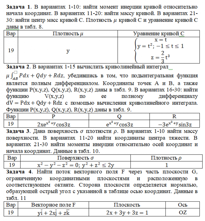 Задача 1. В вариантах 1-10: найти момент инерции кривой относительно начала координат. В вариантах 11-20: найти массу кривой. В вариантах 21-30: найти центр масс кривой С. Плотность кривой С и уравнение кривой С даны в табл. 8. Задача 2. В вариантах 1-15 вычислить криволинейный интеграл , убедившись в том, что подынтегральная функция является полным дифференциалом. Координаты точек Aи B, а также функции P(x,y,z), Q(x,y,z), R(x,y,z) даны в табл. 9. В вариантах 16-30: найти функцию V(x,y,z) по ее полному дифференциалу с помощью вычисления криволинейного интеграла. Функции P(x,y,z), Q(x,y,z), R(x,y,z) даны в табл. 9. Задача 3.
