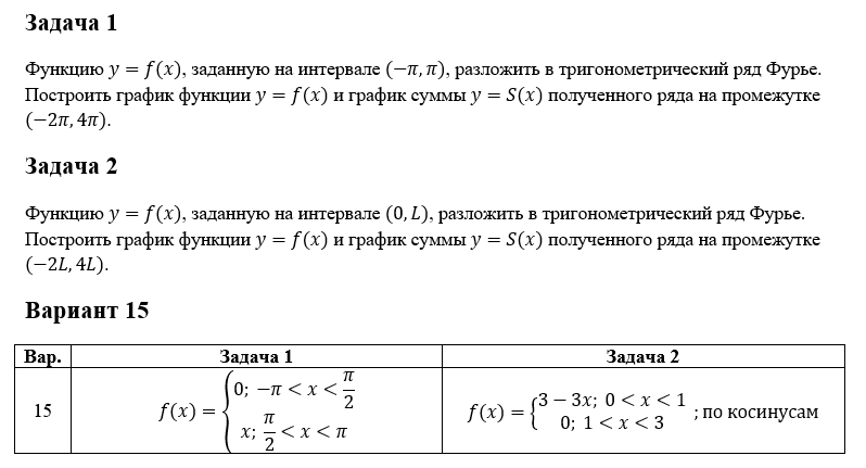 Задача 1 Функцию y=f(x), заданную на интервале (-π,π), разложить в тригонометрический ряд Фурье. Построить график функции y=f(x) и график суммы y=S(x) полученного ряда на промежутке (-2π,4π). Задача 2 Функцию y=f(x), заданную на интервале (0,L), разложить в тригонометрический ряд Фурье. Построить график функции y=f(x) и график суммы y=S(x) полученного ряда на промежутке (-2L,4L). Вариант 15 Вар.Задача 1Задача 2 15f(x)={█(0; -π<x<π/2@x; π/2<x<π)┤f(x)={█(3-3x; 0<x<1@0; 1<x<3)┤ ;по косинусам .