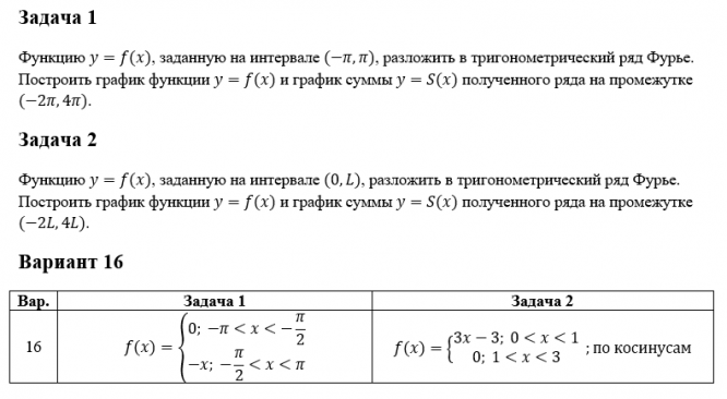 Задача 1 Функцию y=f(x), заданную на интервале (-π,π), разложить в тригонометрический ряд Фурье. Построить график функции y=f(x) и график суммы y=S(x) полученного ряда на промежутке (-2π,4π). Задача 2 Функцию y=f(x), заданную на интервале (0,L), разложить в тригонометрический ряд Фурье. Построить график функции y=f(x) и график суммы y=S(x) полученного ряда на промежутке (-2L,4L). Вариант 16 Вар.Задача 1Задача 2 16f(x)={█(0; -π<x<-π/2@-x; -π/2<x<π)┤f(x)={█(3x-3; 0<x<1@0; 1<x<3)┤ ;по косинусам .