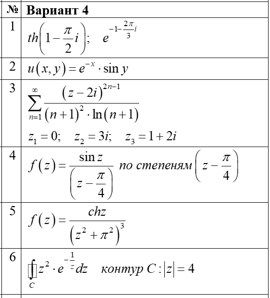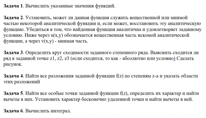Задача 1. Вычислить указанные значения функций. Задача 2. Установить, может ли данная функция служить вещественной или мнимой частью некоторой аналитической функции и, если может, восстановить эту аналитическую функцию. Убедиться в том, что найденная функция аналитична и удовлетворяет заданному условию. Ниже через u(x,y) обозначается вещественная часть искомой аналитической функции, а через v(x,y) - мнимая часть. Задача 3. Определить круг сходимости заданного степенного ряда. Выяснить сходится ли ряд в заданной точке z1, z2, z3 (если сходится, то как - абсолютно или условно) Сделать рисунок. Задача 4. Найти все разложения заданной функции f(z) по степеням z-a и указать области этих разложений Задача 5.