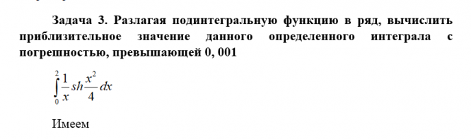 Задача 3. Разлагая подинтегральную функцию в ряд, вычислить приблизительное значение данного определенного интеграла с погрешностью, превышающей 0, 001