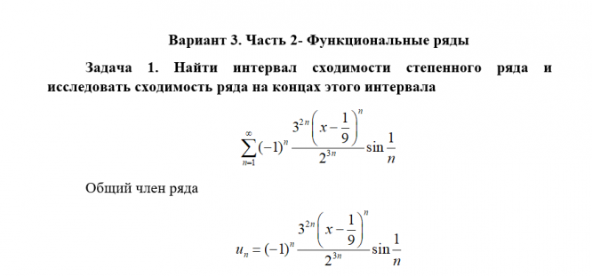 Задача 1. Найти интервал сходимости степенного ряда и исследовать сходимость ряда на концах этого интервалаЗадача 2. Разложить функцию f(x) в степенной ряд по степеням, используя табличные разложеня; указать интервал сходимости