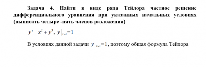 Задача 4. Найти в виде ряда Тейлора частное решение дифференциального уравнения при указанных начальных условиях (выписать четыре -пять членов разложения)