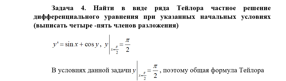 Задача 4. Найти в виде ряда Тейлора частное решение дифференциального уравнения при указанных начальных условиях (выписать четыре -пять членов разложения)