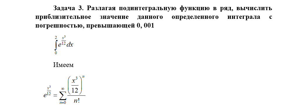 Задача 3. Разлагая подинтегральную функцию в ряд, вычислить приблизительное значение данного определенного интеграла с погрешностью, превышающей 0, 001
